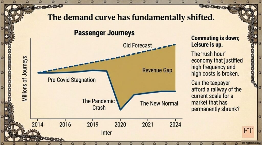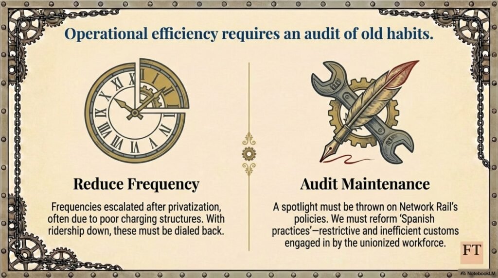 Fallen ridership suggests also there is scope for reducing service frequencies. Frequencies escalated after rail privatisation, to some extent due to a lack of a sensible charging structure for use of congested tracks. A review and audit of services will no doubt justify the vast bulk of those existing, which then throws the spotlight on operational efficiencies and particularly on Network Rail’s maintenance and renewal policies including old Spanish practices engaged in by its unionised workforce.