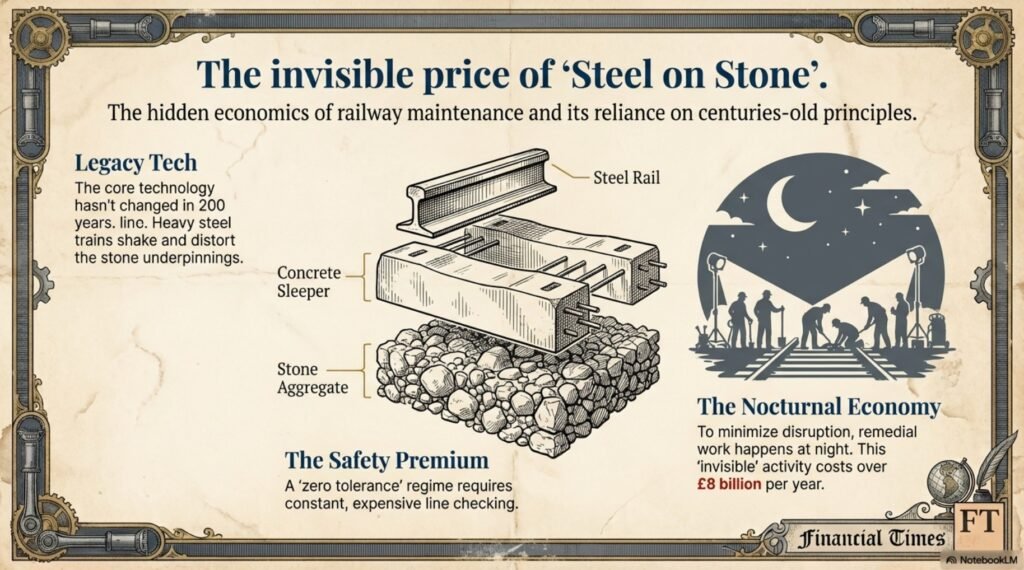Why are the railways so expensive? In part it is because of a legacy technology: steel rail rafted and bedded on large quantities of stone aggregate lie at its heart just as was the case nearly two centuries ago. Several hundred tonnes of rolling stock (staffed by well-paid, if not overpaid, crew) moving rapidly along rails, shake and distort the track’s underpinnings. With a safety regime of zero tolerance, constant line checking leads to constant maintenance. Costly in itself but made more so because, to minimise service disruption, most remedial work is undertaken at weekends or, as neighbouring insomniacs know well, late at night, using labour adequately compensated for the unsocial working hours involved. The travelling public do not as a rule see this nocturnal activity and therefore do not appreciate its extent, nor expense (over £8 billion p.a.).