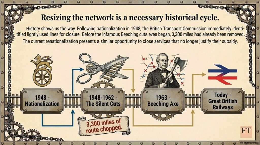 The government might economise by seriously examining its current proclivity to open more stations and lines. Its push to decarbonise much of the car stock by the early 2030s weakens the railway’s environmental advantage. For similar reasons, a review of lightly used services is called for. Following World War II and rail’s nationalisation in 1948, the British Transport Commission lost little time in setting-up a committee tasked with identifying lightly used lines suitable for closure. During the following 14 years, and before Beeching, 3,300 miles of route was chopped from the publicly owned and run railway. The Government’s decision to renationalise might at least present a similar opportunity for review.